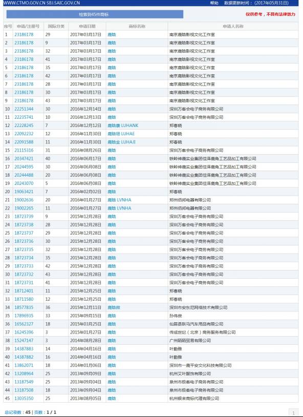 根据商标网2017年5月31日更新数据,目前共有45件“鹿晗”或者包含“鹿晗”的商标申请,已有12件“鹿晗”商标获得注册,12件“鹿晗”商标获得初步审定公告,最早商标申请日为2013年8月5日。